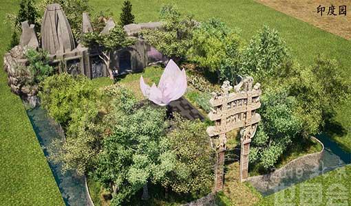 印度展园通过森林、花园、水景的空间转换,结合印度特色建筑、音乐等元素,给游客带来丰富的五感体验,展示印度艺术和建筑的发展。印度展园总面积约1000平方米,展园大门融合印度历史建筑风格,园内水景体现印度哲学对水的崇敬,建筑反映各时期的标志性风格,建筑旁还设有小型演艺区和手工艺亭。瑜伽手印雕塑、绘画等印度艺术品也在园内得到充分展示。
