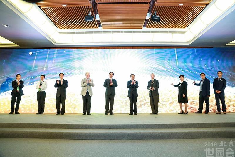 上海合作组织秘书长、2019北京世园会植物馆名誉馆长拉•阿利莫夫,国家林业与草原局副局长刘东生,2019北京世园会组委会委员、北京世园会政府总代表王锦珍,国家花卉协会副会长吴晓松,北京市政府副秘书长陈蓓,深圳市委常委、市政府党组成员杨洪,北京世园局副局长叶大华、总工程师张兰年,万科集团总裁、首席执行官祝九胜、副总裁丁长峰共同开启北京世园会植物馆开馆倒计时一周年发布仪式。